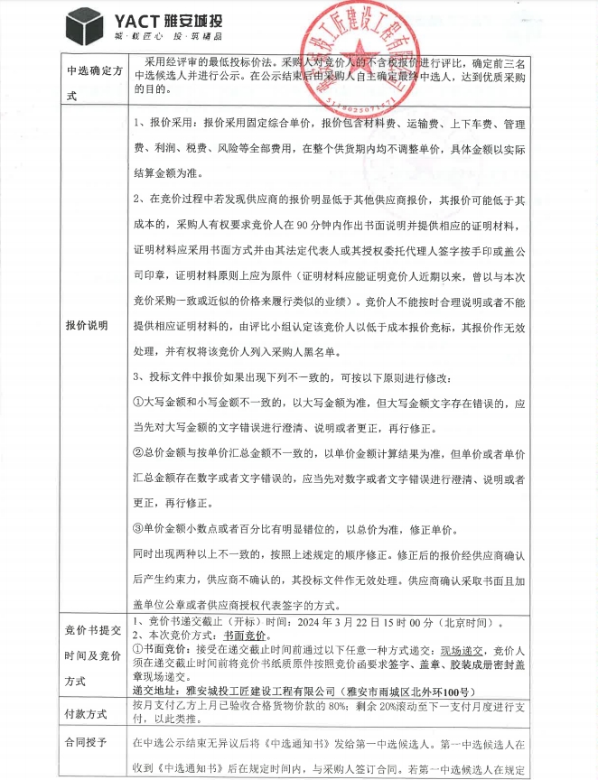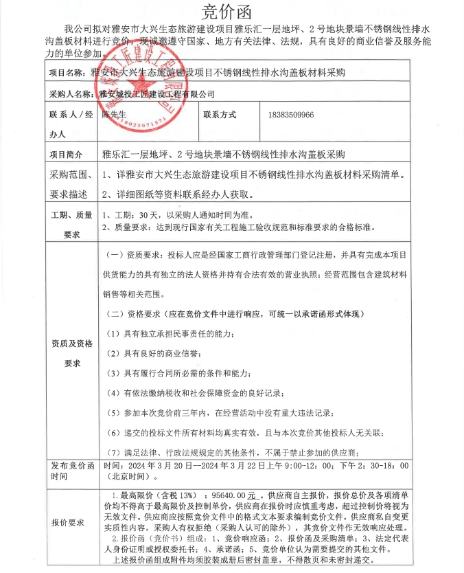雅安市大興生態(tài)旅游建設項目不銹鋼線性排水溝蓋板材料采購競價公告