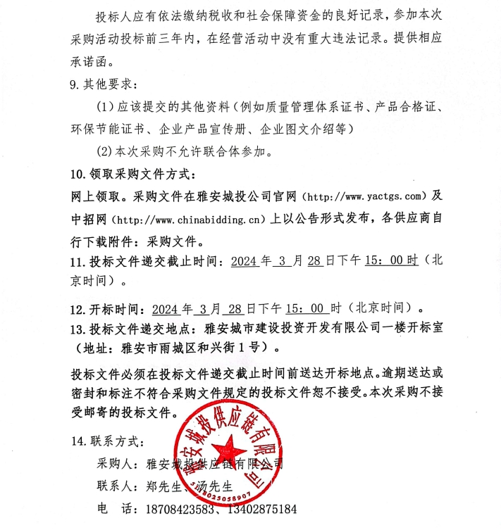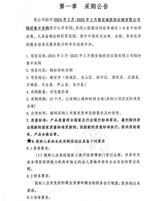 2024年3月-2025年2月雅安城投供應鏈有限公司鋼材集中采購公告