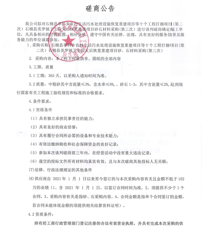 石棉縣草科鄉(xiāng)農(nóng)村生活污水處理設(shè)施恢復(fù)重建項(xiàng)目等十個工程打捆項(xiàng)目(第二次)、石棉縣美羅鎮(zhèn)衛(wèi)生院災(zāi)后恢復(fù)重建項(xiàng)目砂石材料采購(第三次)磋商公告
