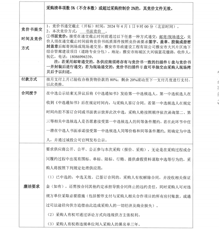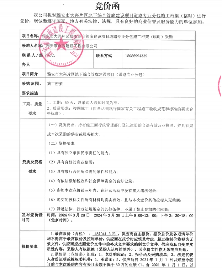 雅安市大興片區(qū)地下綜合管廊建設(shè)項目道路專業(yè)分包施工桁架(臨時)采購競價公告