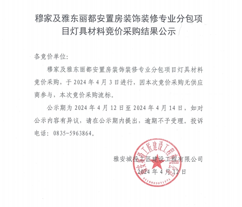 穆家及雅東麗都安置房裝飾裝修專業(yè)分包項目燈具材料競價采購結(jié)果公示