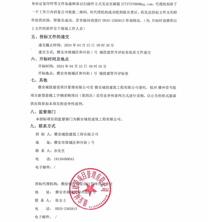 雅州壹號(hào)院項(xiàng)目新型懸挑工字鋼采購(gòu)項(xiàng)目(第四次)公告