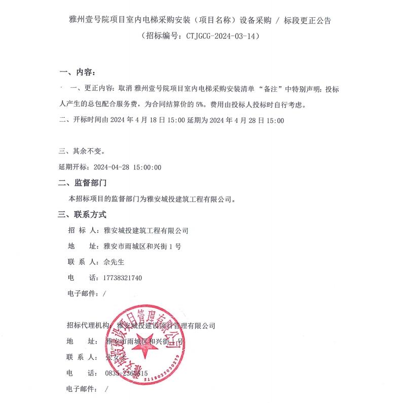 雅州壹號院項(xiàng)目室內(nèi)電梯采購安裝(項(xiàng)目名稱)設(shè)備采購/標(biāo)段更正公告
