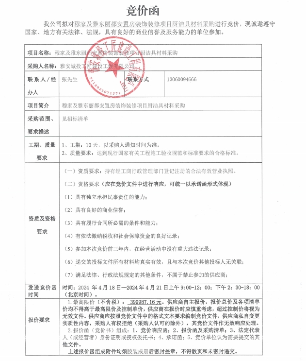 穆家及雅東麗都安置房裝飾裝修項(xiàng)目廚潔具材料采購(gòu)(第三次)競(jìng)價(jià)公告