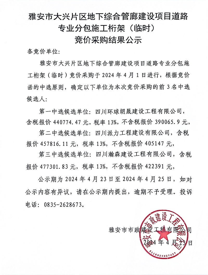 雅安市大興片區(qū)地下綜合管廊建設(shè)項(xiàng)目道路專業(yè)分包施工桁架(臨時(shí))競價(jià)采購結(jié)果公示