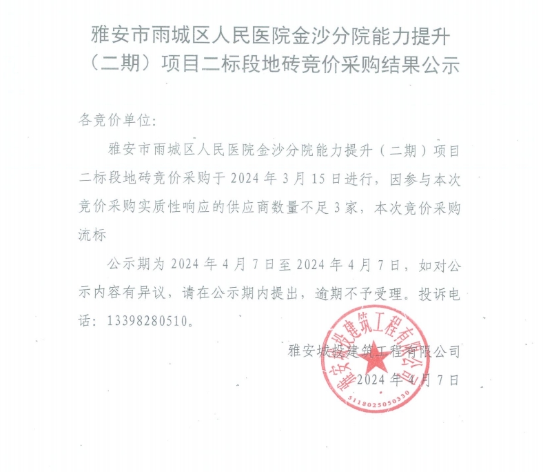 雅安市雨城區(qū)人民醫(yī)院金沙分院能力提升(二期)項目二標段地磚競價采購結(jié)果公示