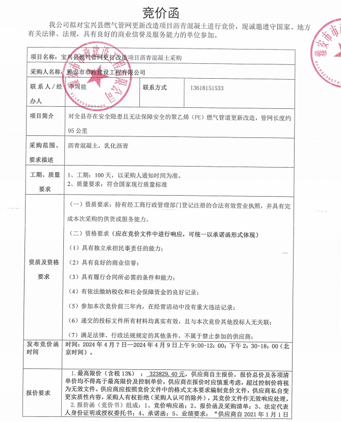 寶興縣燃氣管網更新改造項目瀝青混凝土競價公告