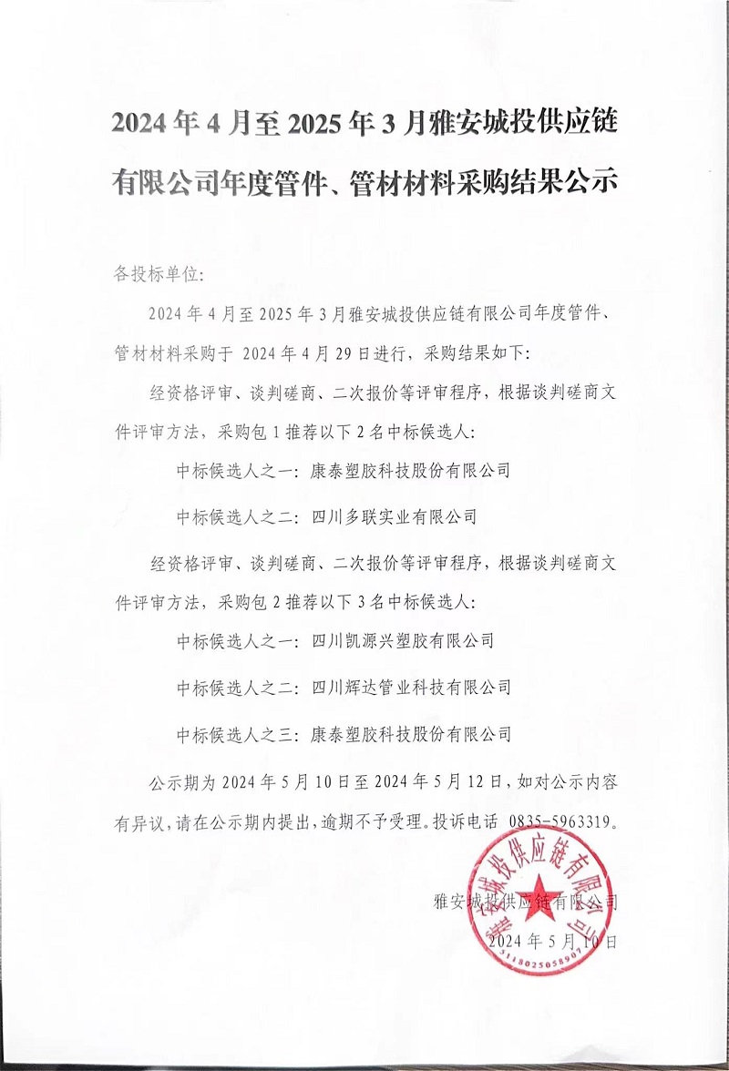 2024年4月至2025年3月雅安城投供應(yīng)鏈有限公司年度管件、管材材料采購結(jié)果公示