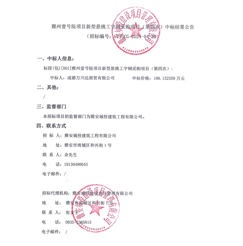 雅州壹號院項目新型懸挑工字鋼采購項目(第四次)中標(biāo)結(jié)果公告