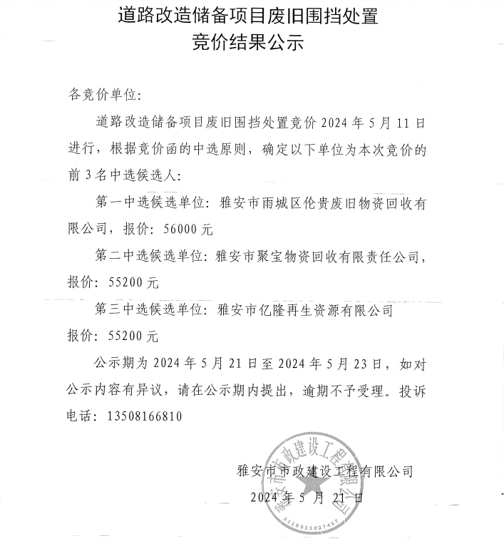 道路改造儲(chǔ)備項(xiàng)目廢舊圍擋處置競(jìng)價(jià)結(jié)果公示