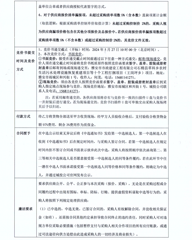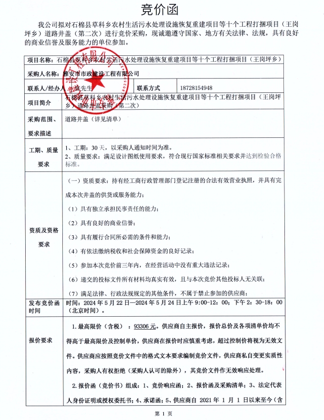 石棉縣草科鄉(xiāng)農(nóng)村生活污水處理設(shè)施恢復(fù)重建項(xiàng)目等十個(gè)工程打捆項(xiàng)目(王崗坪鄉(xiāng))道路井蓋競(jìng)價(jià)采購(gòu)(第二次)競(jìng)價(jià)公告