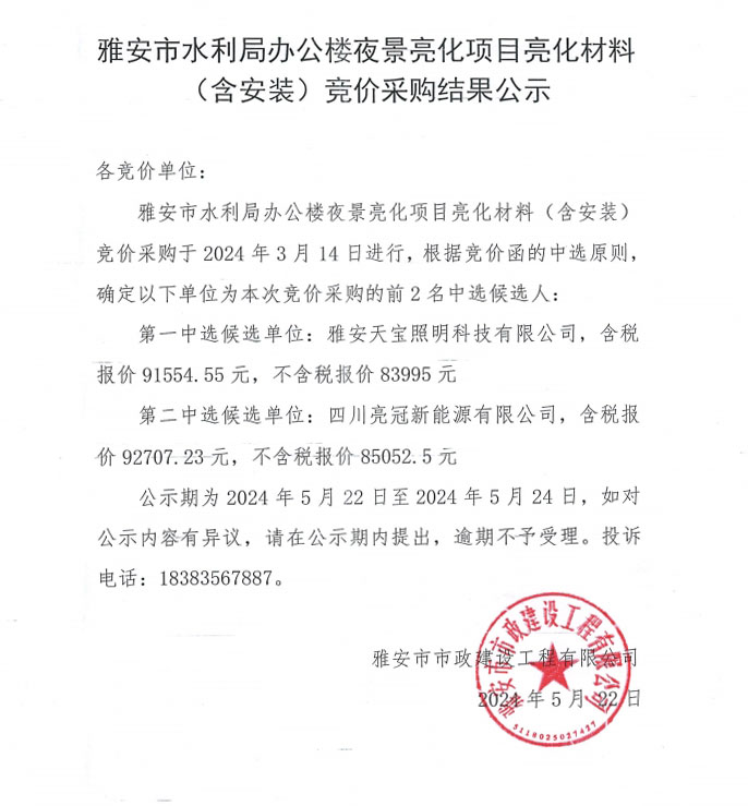 雅安市水利局辦公樓夜景亮化項(xiàng)目亮化材料(含安裝)競(jìng)價(jià)采購結(jié)果公示