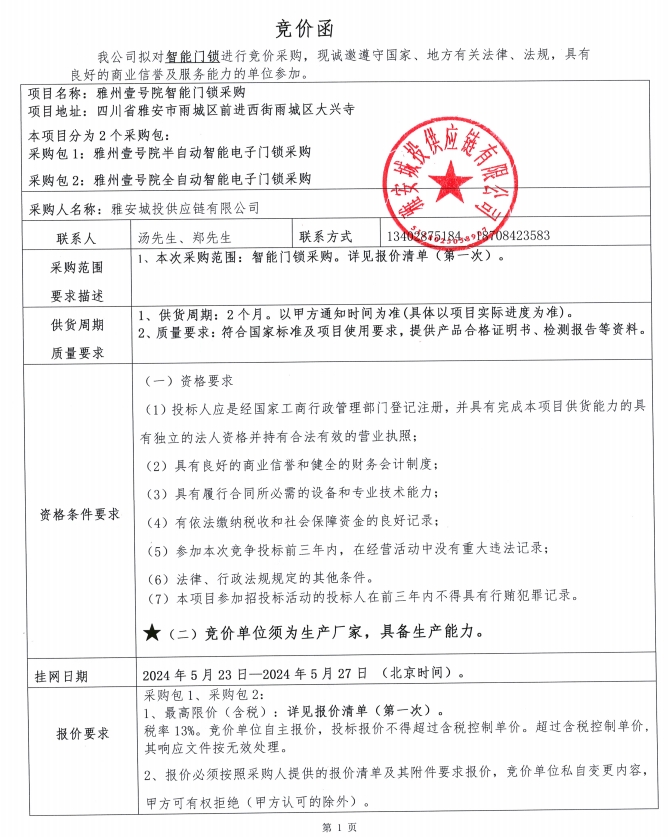 附件1:競(jìng)價(jià)函--雅州壹號(hào)院智能門鎖采購(gòu)