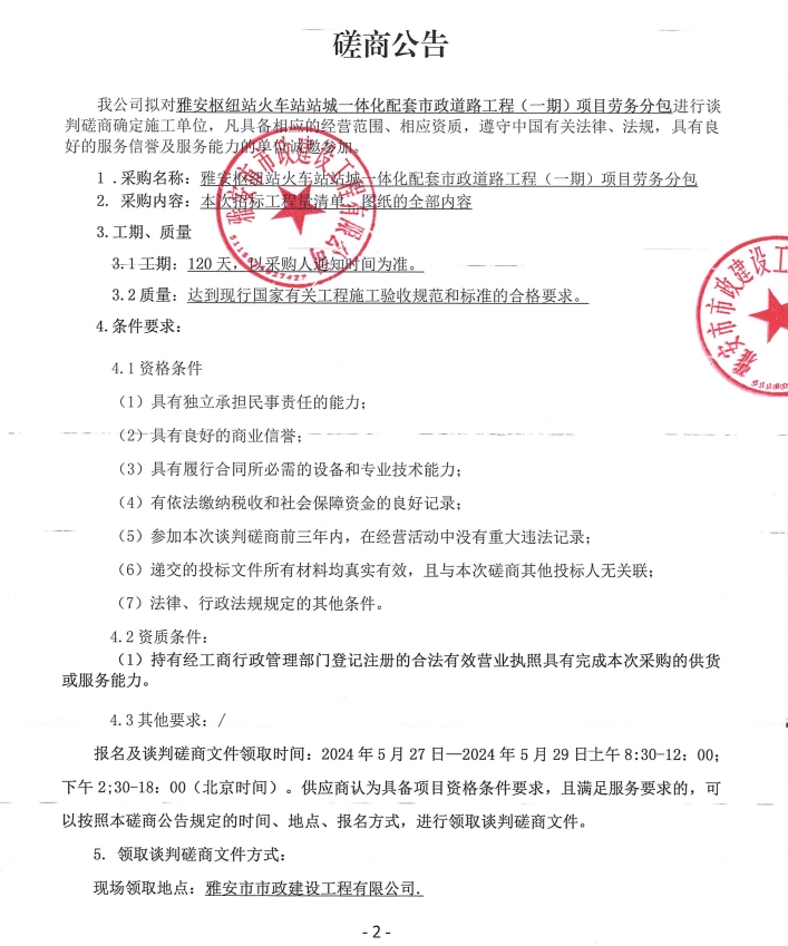 雅安樞紐站火車(chē)站站城一體化配套市政道路工程(一期)項(xiàng)目勞務(wù)分包磋商公告