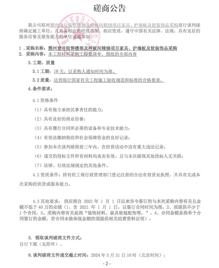 雅州壹號院售樓部及樣板間精修項目家具、護(hù)墻板及軟裝飾品采購磋商公告