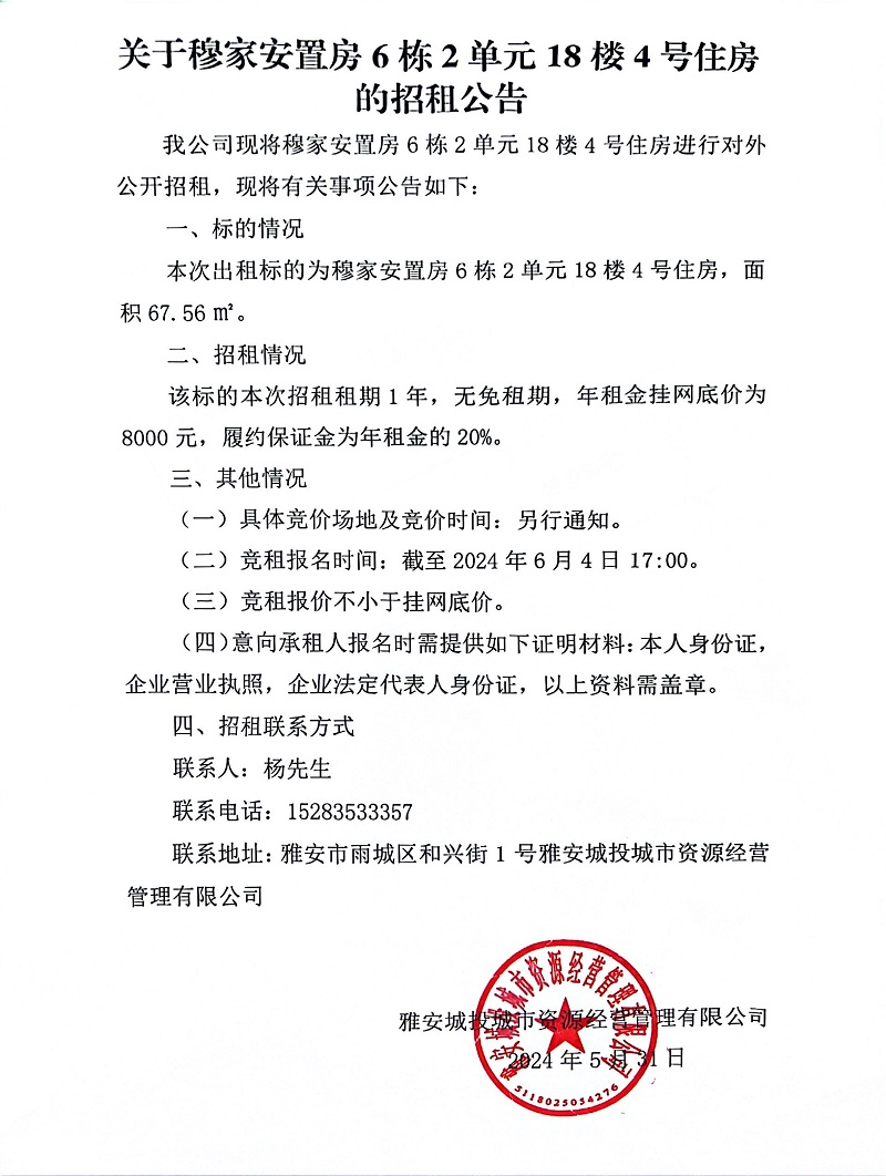 關于穆家安置房6棟2單元5樓4號住房的招租公告
