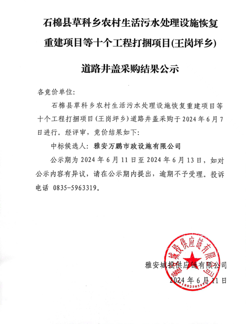 石棉縣草科鄉(xiāng)農(nóng)村生活污水處理設(shè)施恢復(fù)重建項目等十個工程打捆項目(王崗坪鄉(xiāng))道路井蓋采購結(jié)果公示