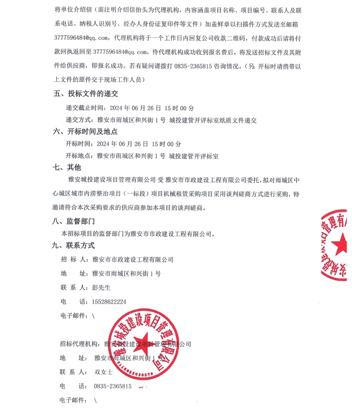 雨城區(qū)中心城區(qū)城市內(nèi)澇整治項目(一標(biāo)段)項目機械租賃采購項目招標(biāo)公告