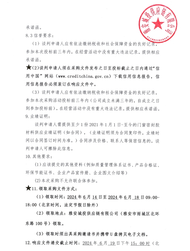 2024年6月至2025年5月雅安城投供應鏈有限公司門窗密封膠集中采購公告