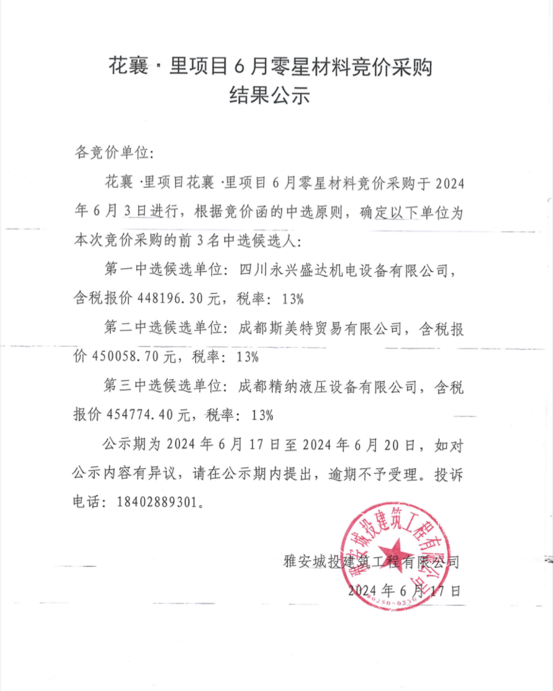 花襄·里項目6月零星材料競價采購結(jié)果公示