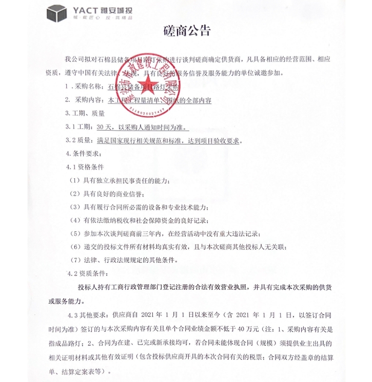 石棉縣儲(chǔ)備項(xiàng)目路燈采購(gòu)談判磋商公告