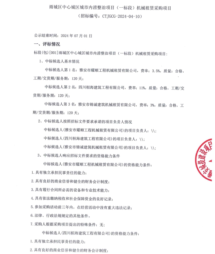 雨城區(qū)中心城區(qū)城市內(nèi)澇整治項目(一標(biāo)段)項目機械租賃采購項目公示