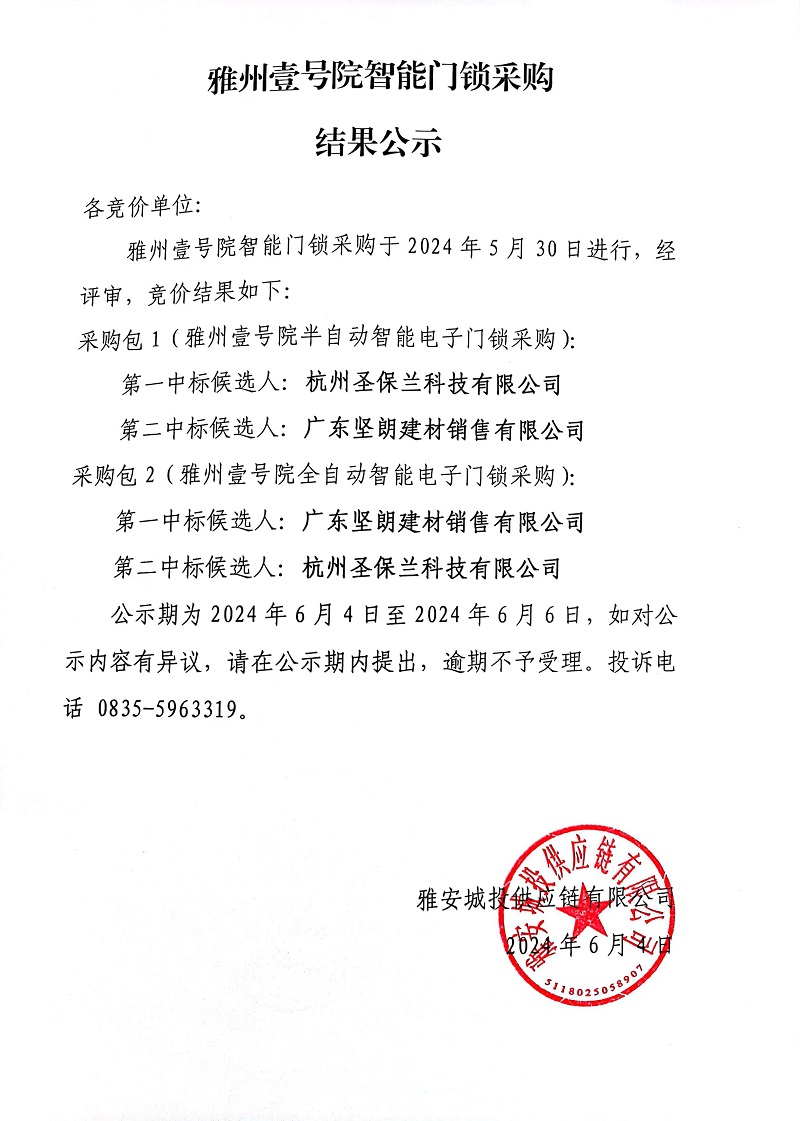 雅州壹號(hào)院智能門鎖采購結(jié)果公示