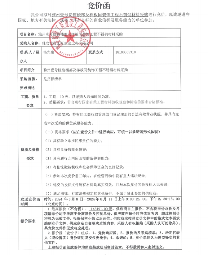雅州壹號(hào)院售樓部及樣板間裝飾工程不銹鋼材料采購(gòu)競(jìng)價(jià)公告