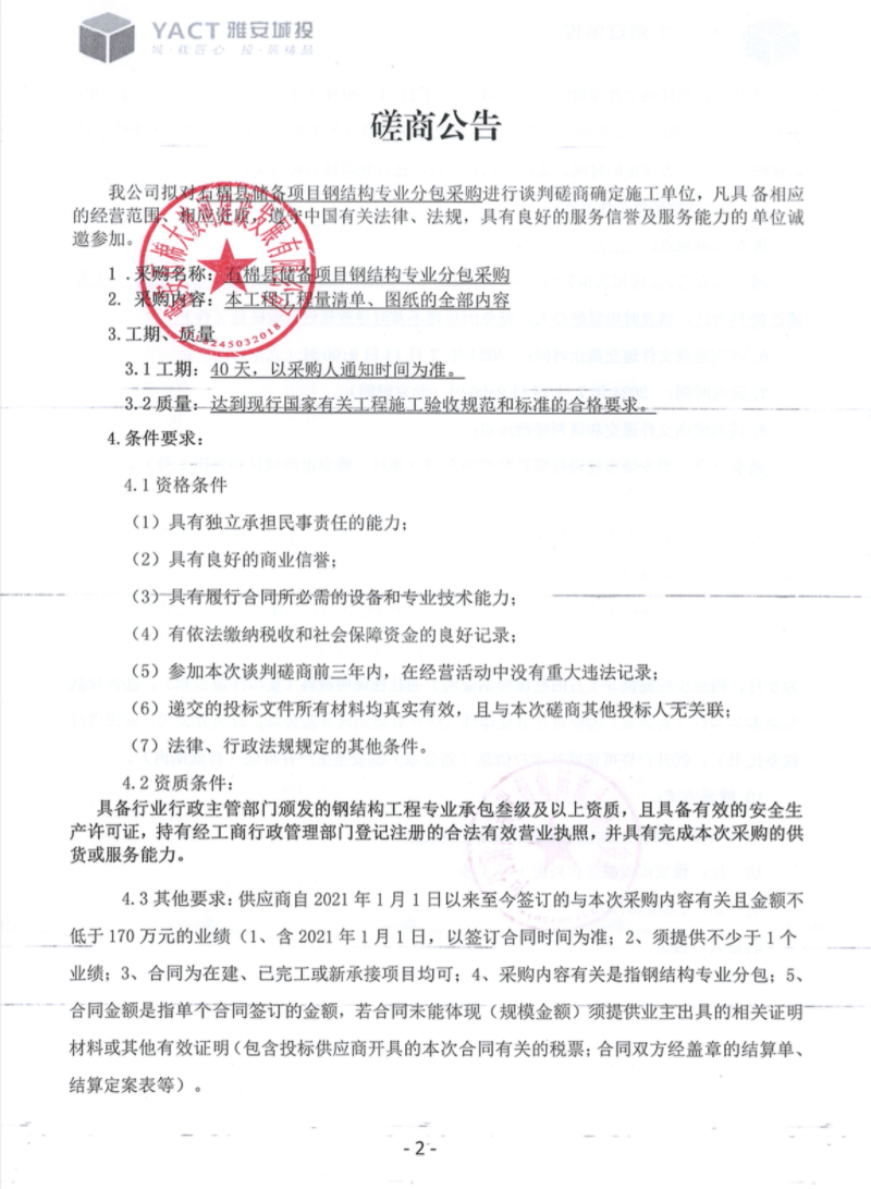 石棉縣儲備項目鋼結(jié)構(gòu)專業(yè)分包采購談判磋商公告