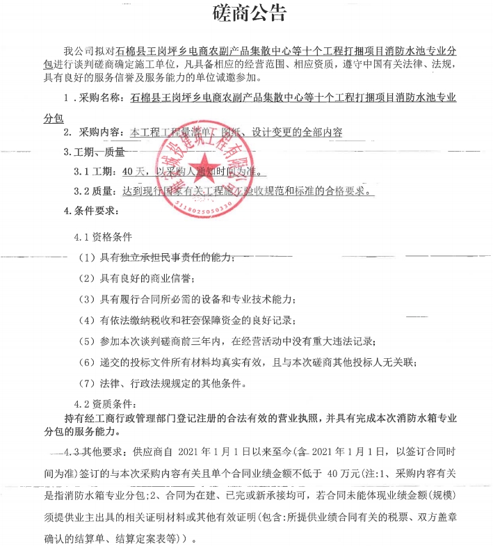 石棉縣王崗坪鄉(xiāng)電商農(nóng)副產(chǎn)品集散中心等十個(gè)工程打捆項(xiàng)目消防水池專業(yè)分包談判磋商公告