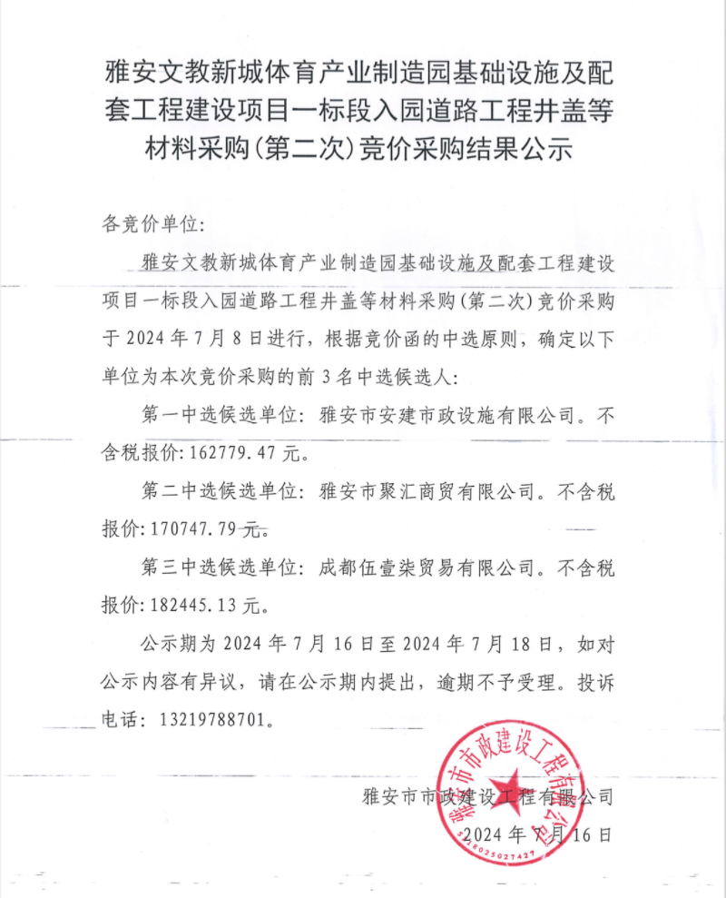 雅安文教新城體育產(chǎn)業(yè)制造園基礎(chǔ)設(shè)施及配套工程建設(shè)項目一標(biāo)段入園道路工程井蓋等材料采購(第二次)競價采購結(jié)果公示