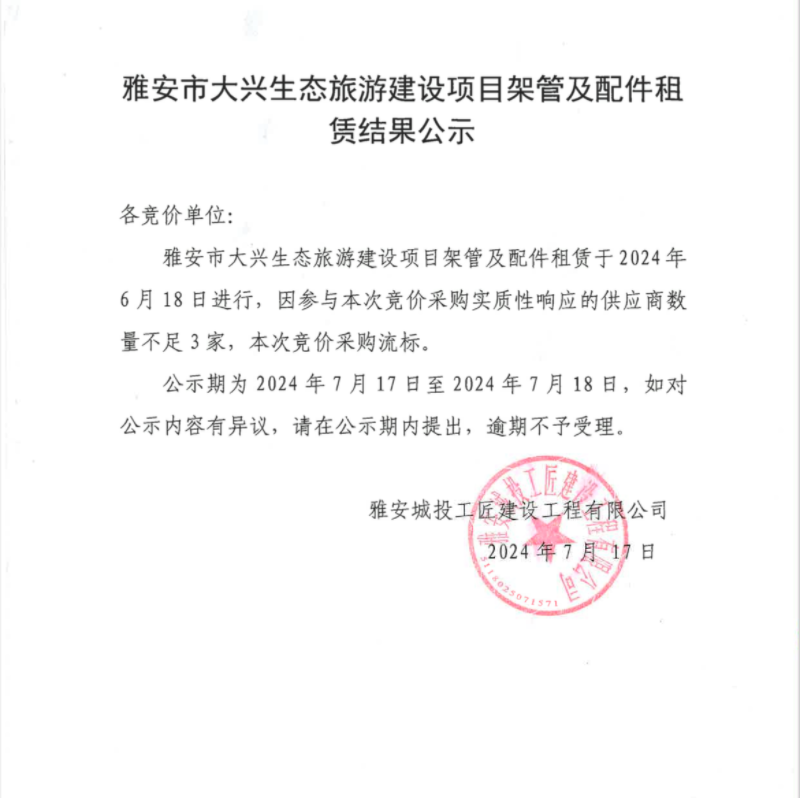 雅安市大興生態(tài)旅游建設(shè)項(xiàng)目架管及配件租賃結(jié)果公示