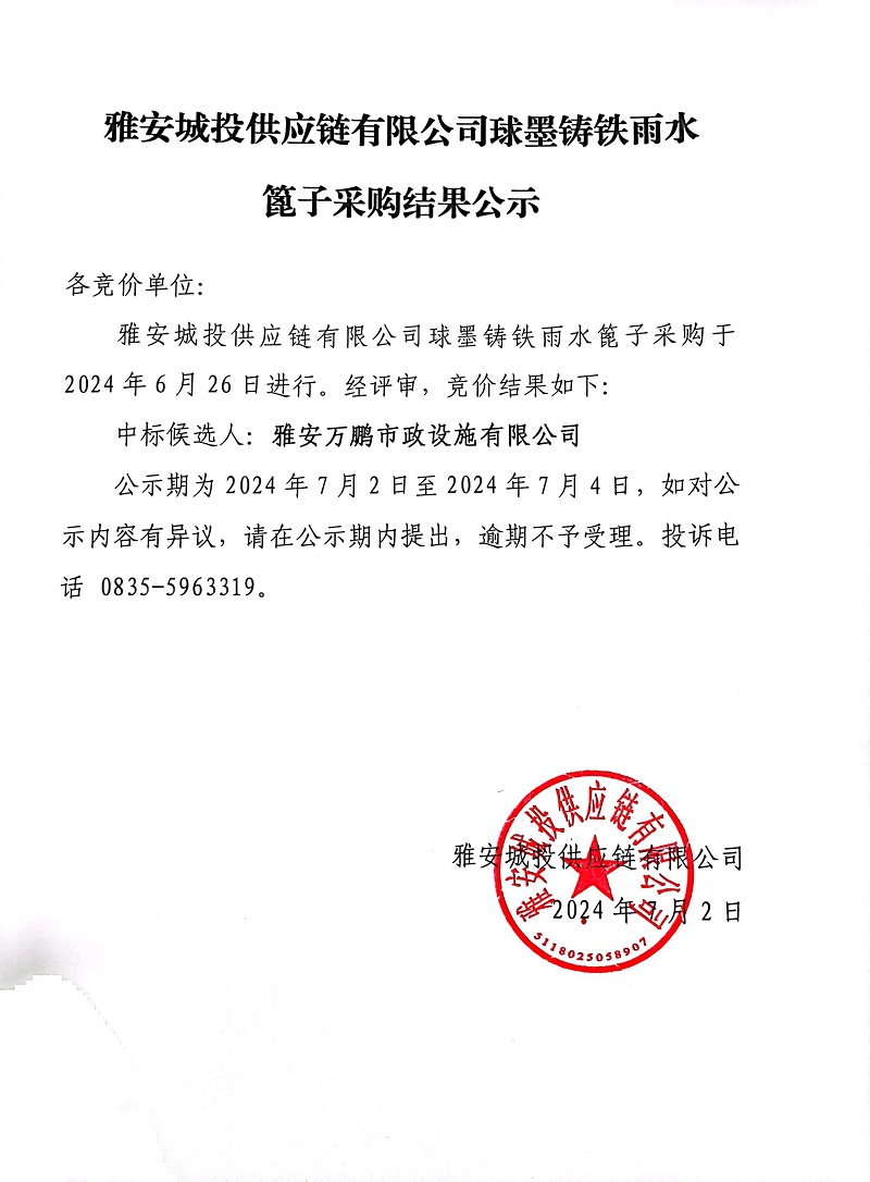 雅安城投供應(yīng)鏈有限公司球墨鑄鐵雨水篦子采購(gòu)結(jié)果公示