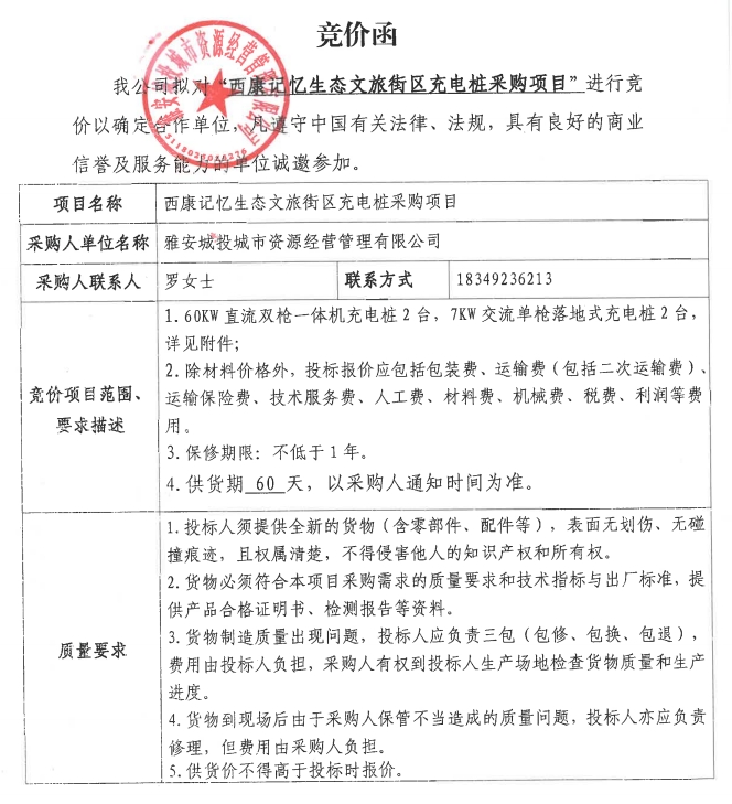 雅安城投城市資源經(jīng)營管理有限公司西康記憶生態(tài)文旅街區(qū)充電樁采購項(xiàng)目競價(jià)公告