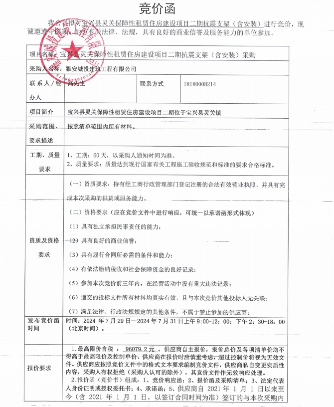 寶興縣靈關(guān)保障性租賃住房建設(shè)項(xiàng)目二期抗震支架(含安裝)采購(gòu)競(jìng)價(jià)公告