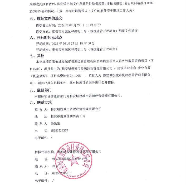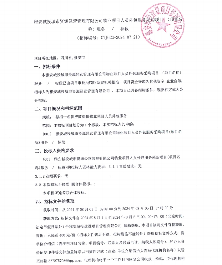 雅安城投城市資源經(jīng)營(yíng)管理有限公司物業(yè)項(xiàng)目人員外包服務(wù)采購(gòu)項(xiàng)目(項(xiàng)目名稱)服務(wù)/標(biāo)段公告