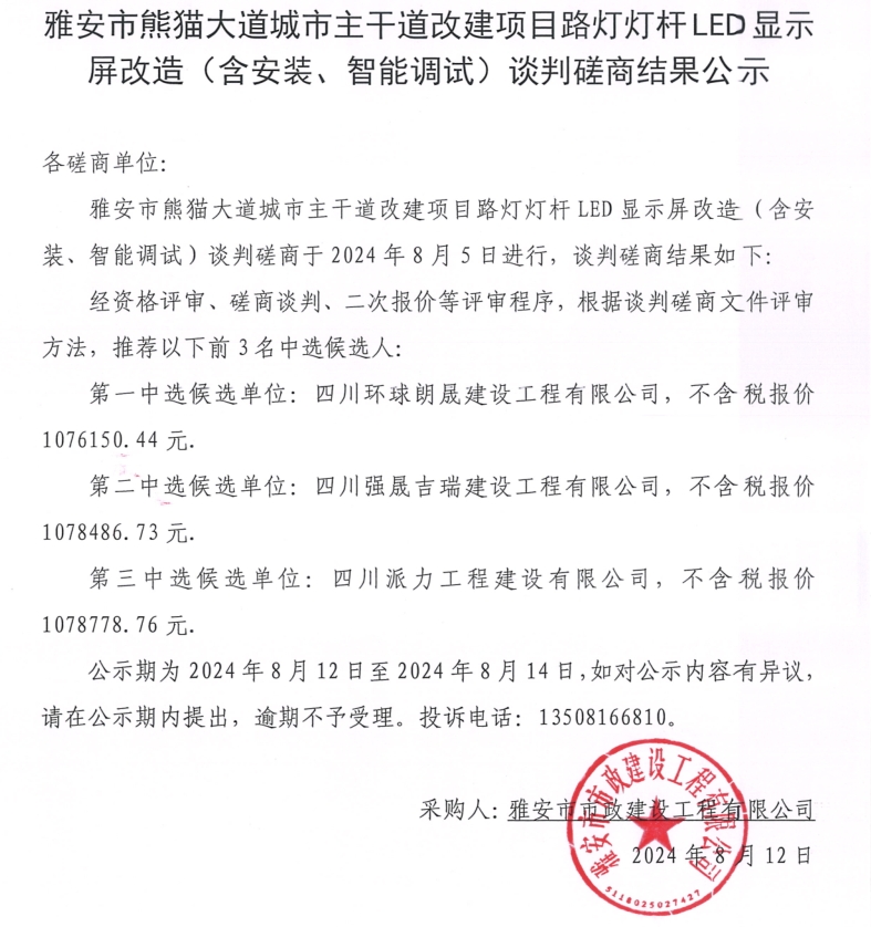 雅安市熊貓大道城市主干道改建項目路燈燈桿LED顯示屏(含安裝、智能化調(diào)試)談判磋商結(jié)果公示