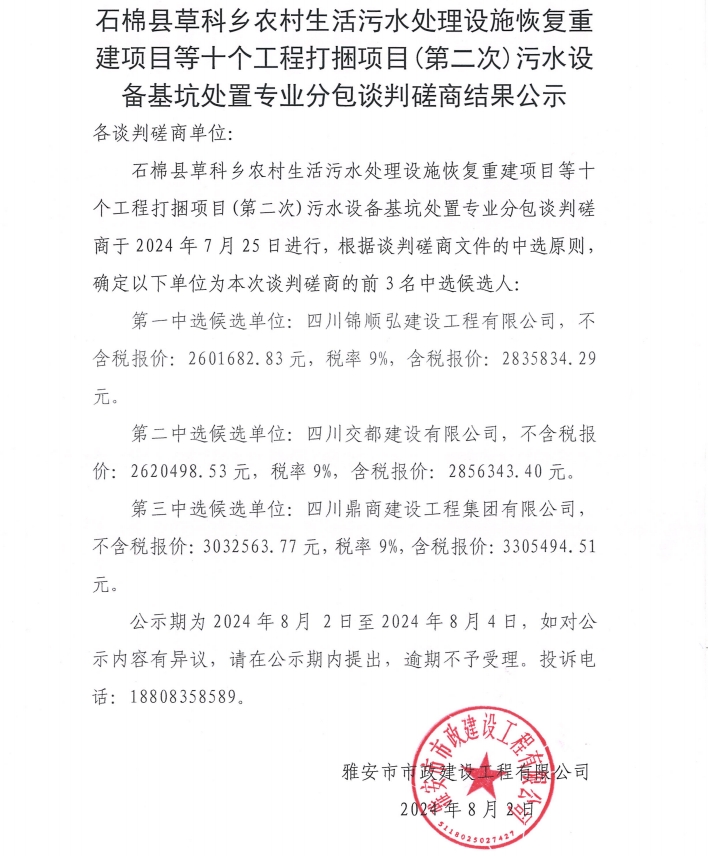 石棉縣草科鄉(xiāng)農(nóng)村生活污水處理設(shè)施恢復(fù)重建項(xiàng)目等十個(gè)工程打捆項(xiàng)目(第二次) 污水設(shè)備基坑處置專業(yè)分包談判磋商結(jié)果公示