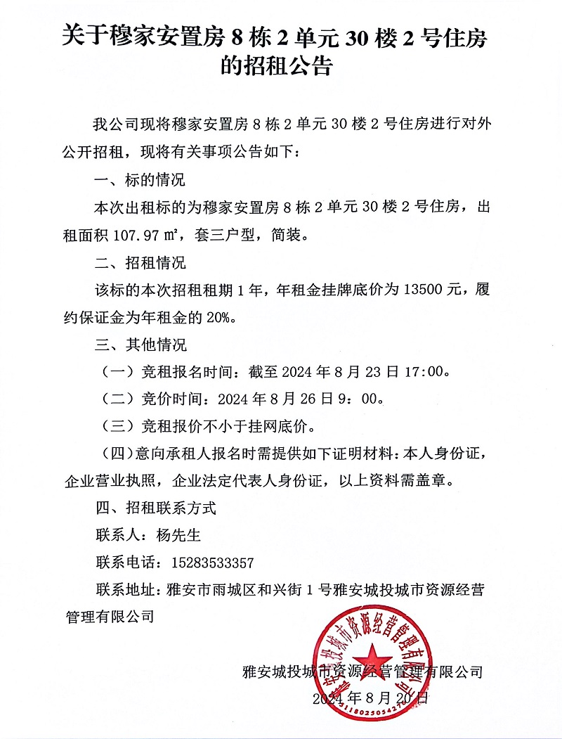 關于穆家安置房8棟2單元30樓2號住房的招租公告