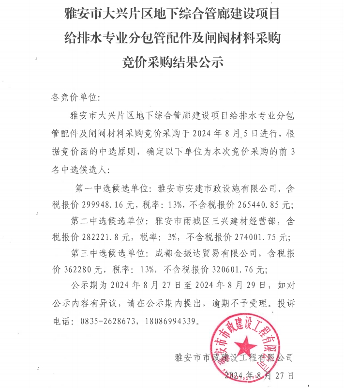 雅安市大興片區(qū)地下綜合管廊建設(shè)項(xiàng)目給排水專(zhuān)業(yè)分包管配件及閘閥材料采購(gòu)結(jié)果公示