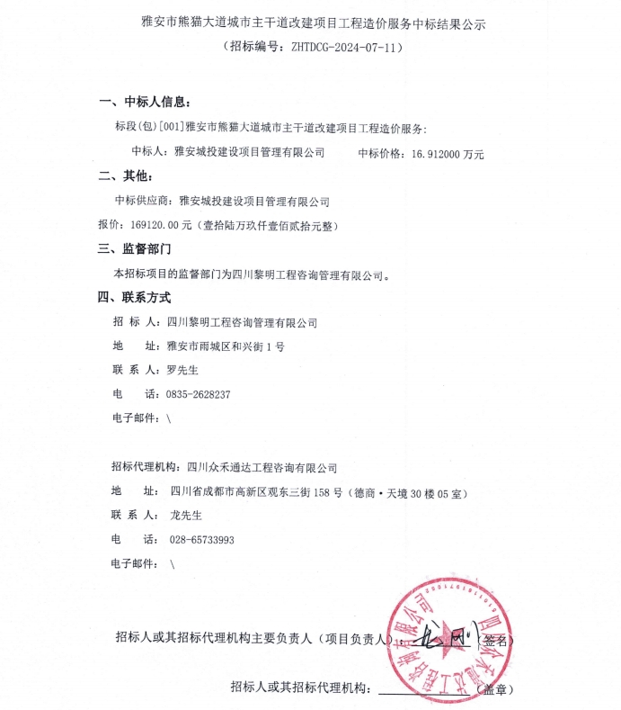 雅安市熊貓大道城市主干道改建項(xiàng)目工程造價(jià)服務(wù)中標(biāo)結(jié)果公示