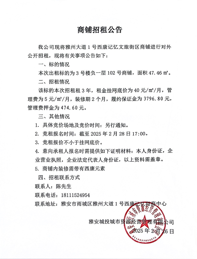 關(guān)于雅州大道1號西康記憶文旅街區(qū)3號樓負(fù)一層102號商鋪招租公告