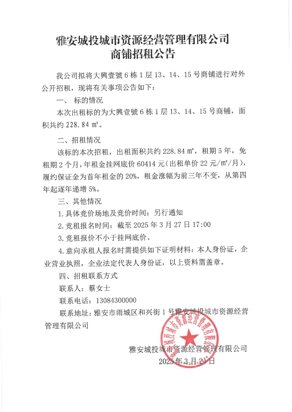 雅安城投城市資源經(jīng)營管理有限公司商鋪招租公告