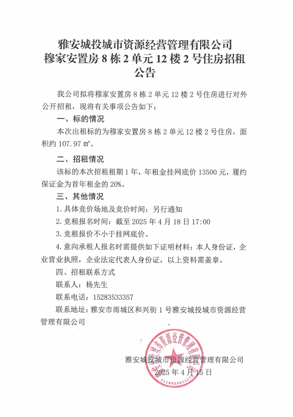 雅安城投城市資源經(jīng)營管理有限公司穆家安置房8棟2單元12樓2號住房招租公告