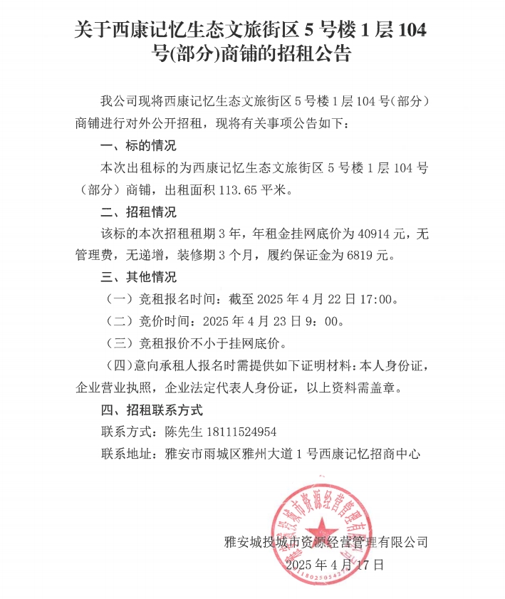 關(guān)于西康記憶生態(tài)文旅街區(qū)5號樓1層104號(部分)商鋪的招租公告