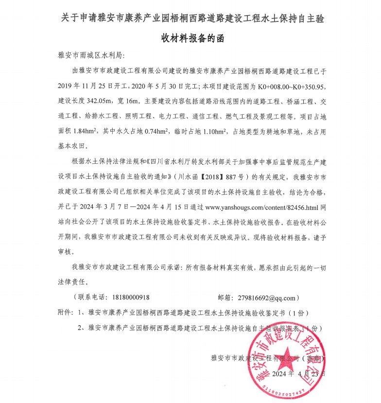 關于申請雅安市康養(yǎng)產業(yè)園梧桐西路道路建設工程水土保持自主驗收材料報備的函